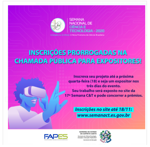 A Secretaria da Ciência, Tecnologia, Inovação e Educação Profissional (Secti) prorrogou a Chamada Pública para professores e estudantes do Ensino Básico, Médio, Técnico e Superior, e profissionais da área de Pesquisa, Inovação, Ciência e Tecnologia participarem como expositores da 17ª Semana Estadual de Ciência e Tecnologia, que será realizada nos dias 25, 26 e 27 de novembro virtualmente.