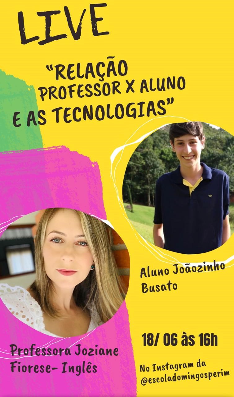 Para realização das Atividades Pedagógicas Não Presenciais, diversas ferramentas tecnológicas estão sendo utilizadas pelas escolas. Nesta sexta-feira (19), os alunos da Escola Estadual de Ensino Fundamental e Médio (EEEFM) Domingos Perim, vão conversar sobre esse assunto durante a “Live Relação Professor x Aluno e as tecnologias”. Será às 15 horas pelo Instagram @escoladomingiosperim. A conversa será conduzida professora de Inglês, Joziane Fiorese, e pelo aluno Joãozinho Busato.