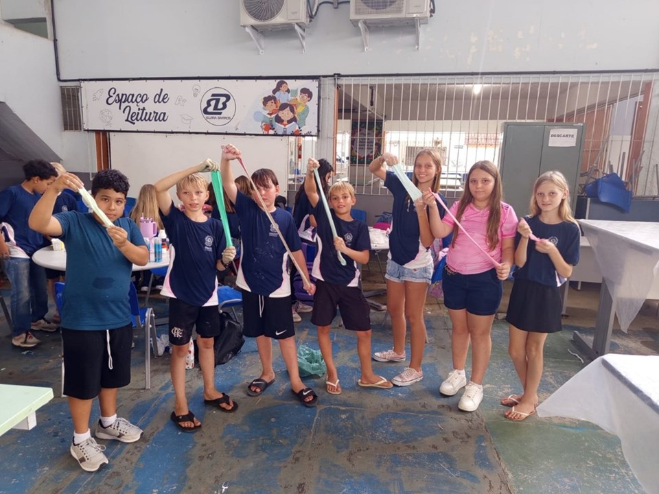 Com as turmas do 6º ano, os estudantes participaram de uma prática sobre misturas homogêneas e heterogêneas, utilizando a produção de slime como recurso pedagógico. Durante a atividade, observaram as etapas de formação da mistura, identificando a homogeneidade entre os componentes e as mudanças de textura e propriedades após a adição do ativador, compreendendo conceitos como fases da matéria e transformações físicas.