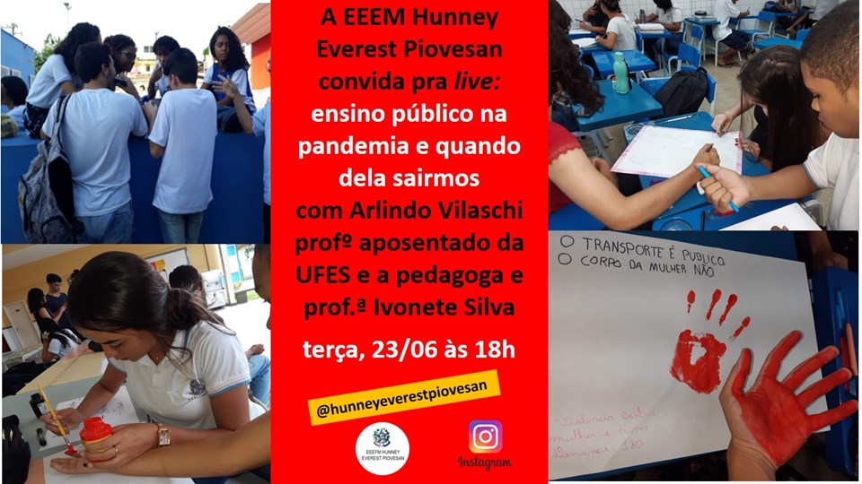 A Escola Hunney Everest Piovesan, em Cariacica, realizou uma live com o tema “Ensino Público na pandemia e quando dela sairmos”. A conversa on-line com os estudantes da Unidade de Ensino, realizada na última terça-feira (23), teve a participação do professor aposentado na Universidade Federal do Espírito Santo (Ufes), Arlindo Vilaschi, e a pedagoga e professora Ivonete Silva.
