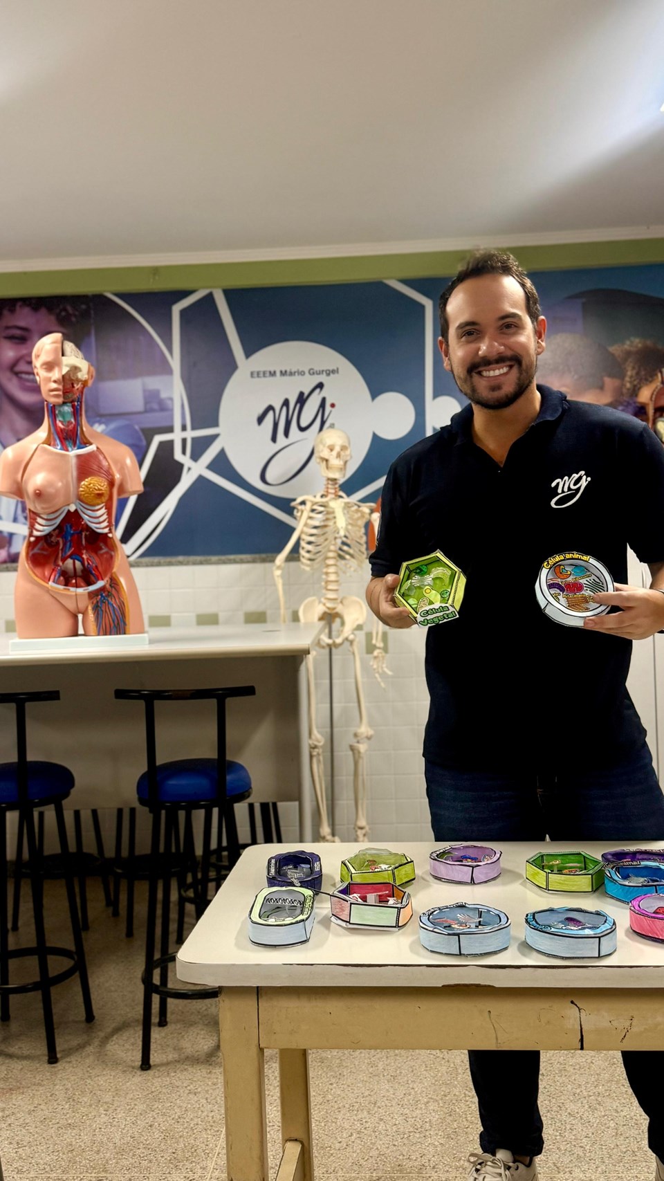 O professor de Biologia e PCA de Ciências da Natureza, Renan dos Santos Brandão, também desenvolveu atividades pautadas em metodologias ativas com turmas da 2ª série do Ensino Médio. A ação teve como foco a construção de modelos tridimensionais de células (animal, vegetal e bacteriana), utilizando materiais de fácil acesso, com ênfase na representação das organelas e de suas respectivas funções. A proposta buscou estimular a aprendizagem significativa, a criatividade e o trabalho colaborativo.