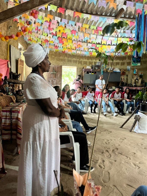 Durante a programação, estudantes e professores participaram de uma imersão no território quilombola, reconhecido pela preservação de tradições afro-brasileiras e pela trajetória histórica de resistência. O grupo foi recebido por lideranças locais, entre elas dona Gessi, que compartilhou relatos sobre identidade, memória, organização comunitária, desafios do território e preservação cultural.