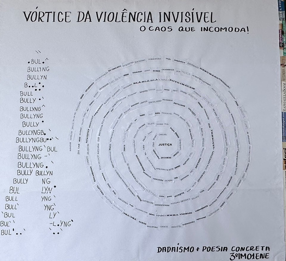 Já sobre a atividade “Vórtice da Violência Invisível – O caos que incomoda”, a aluna Isabella Kepp Ventura comentou como a proposta contribuiu para a reflexão dos estudantes: “Criar esse vórtice foi uma forma de transformar nossa frustração em arte; não queríamos algo bonito, mas algo que causasse desconforto. Ver a palavra ‘Justiça’ cercada por tanta confusão visual nos fez entender que o bullying não é só uma palavra, é uma sensação de sufocamento que a gente finalmente conseguiu materializar”.