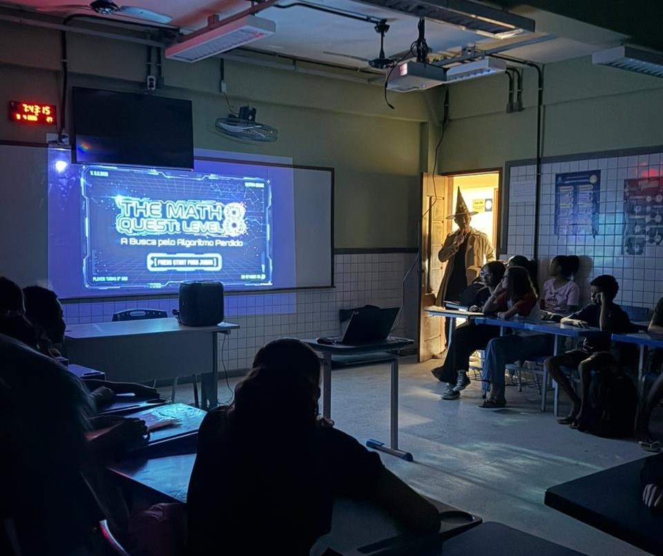 A atividade, intitulada “Quest Matemática: A Busca pelo Algoritmo Perdido”, foi conduzida pelo professor Gabriel Amorim e organizada a partir de uma narrativa estruturada em desafios e missões. Os conteúdos matemáticos foram trabalhados previamente em sala de aula e utilizados como base para o desenvolvimento das atividades propostas durante a dinâmica.