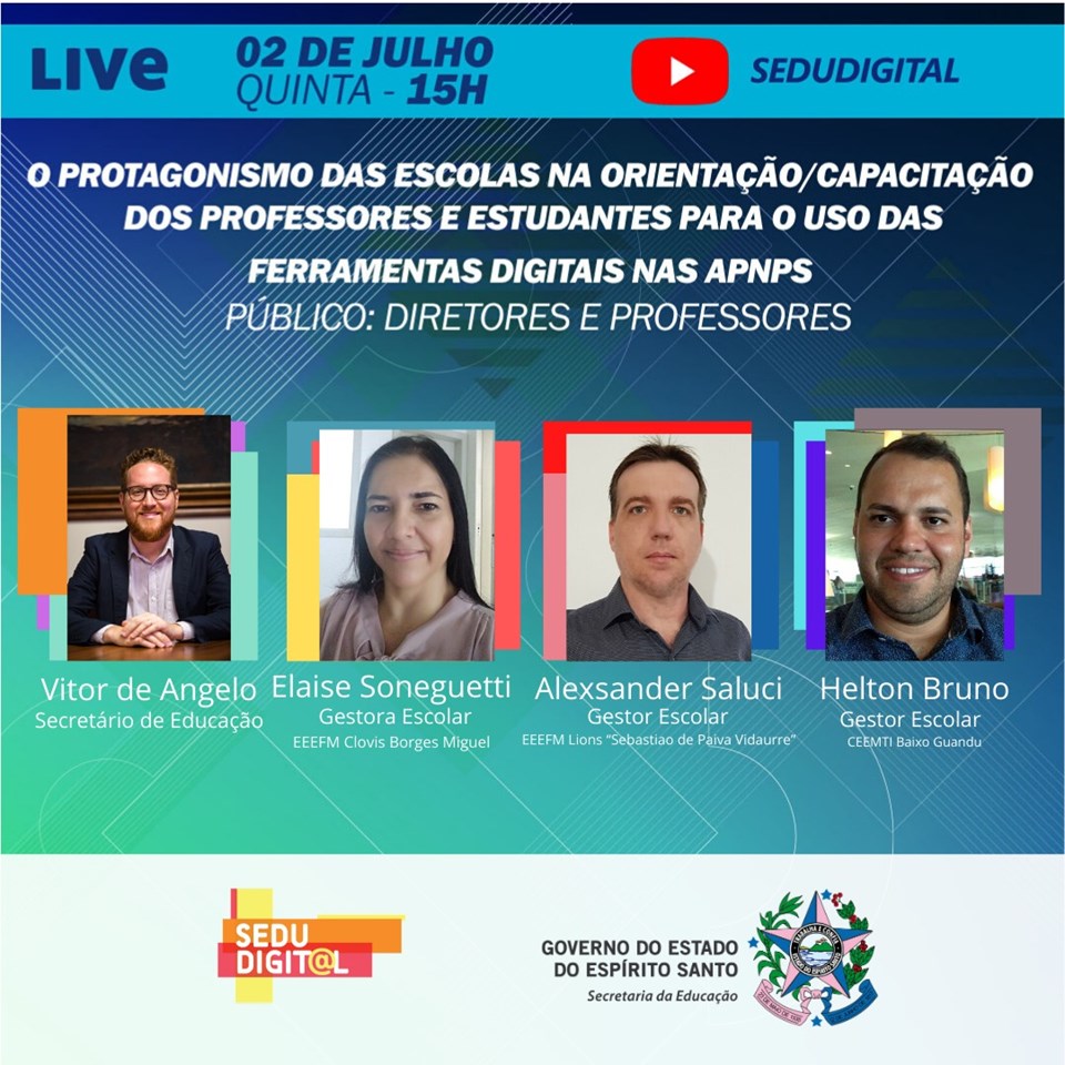 A Secretaria da Educação (Sedu), por meio do Programa Sedu Digital, promoverá uma live sobre “Protagonismo nas Escolas”, nesta quinta-feira (02), às 15 horas. Os públicos-alvo são professores e gestores das unidades escolares da Rede Estadual. O debate contará com a participação do secretário de Estado da Educação, Vitor de Angelo, e diretores de escolas de todo o Estado.