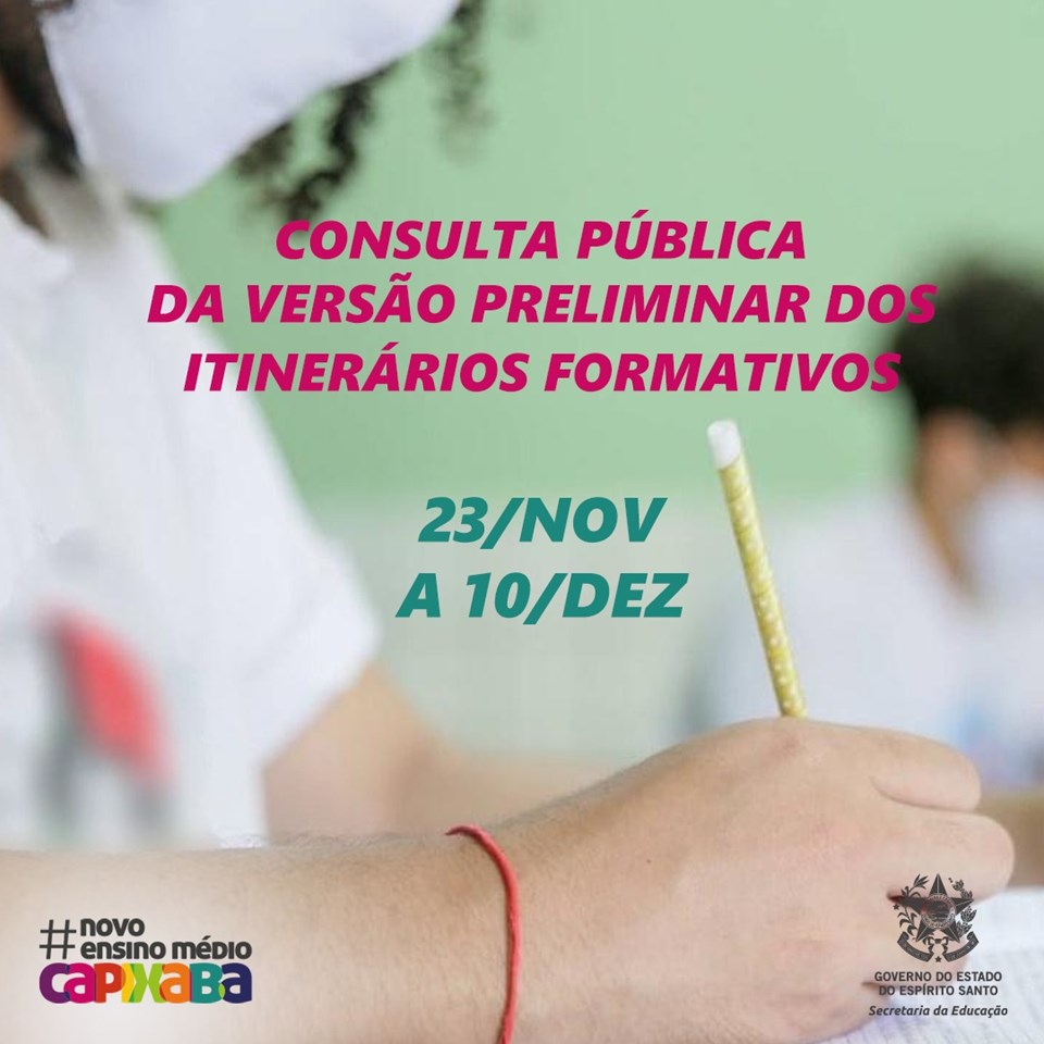 A Secretaria da Educação (Sedu) abriu a Consulta Pública da versão preliminar dos itinerários formativos, que segue até o dia 10 de dezembro. Para participar, basta CLICAR AQUI! A Sedu, por meio da Assessoria de Apoio Curricular e Educação Ambiental, realizou, em 2019, a Consulta Pública da Formação Geral Básica (FGB) do Novo Ensino Médio – conjunto de competências e habilidades das áreas de conhecimento alinhadas ao que prevê a Base Nacional Comum Curricular (BNCC). A Consulta Pública deste ano já está aberta até o dia 10 de dezembro e é parte de maior flexibilidade do currículo, que permitirá aos estudantes da Educação Básica aprofundar os conhecimentos em uma ou mais áreas de seu interesse.