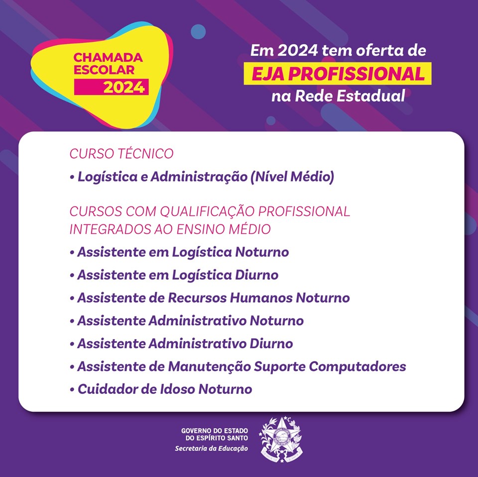 A Chamada Escolar 2024 oferta vagas para todas as modalidades de ensino, incluindo a Educação de Jovens e Adultos (EJA), que, neste ano, conta com mais de 28 mil vagas, sendo 5.120 para a EJA Profissional. A solicitação de Pré-Matrícula segue até o dia 22 de dezembro, por meio do Sistema Estadual de Gestão Escolar. A novidade deste ano é que a EJA Profissional pode ser cursada em três etapas, ou seja, em um ano e meio, sendo que, atualmente, são dois anos.