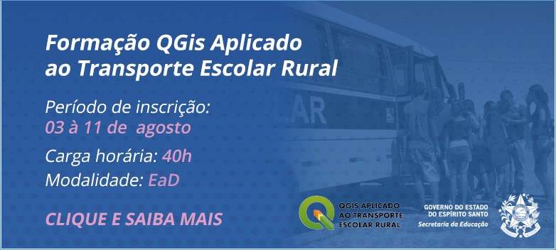 A Formação QGIS Aplicado ao Transporte Escolar Rural, com carga horária de 40 horas na modalidade EAD, está sendo realizada por meio das subsecretarias de Suporte à Educação (SESE) e de Planejamento e Avaliação (SEPLA), por meio das gerências de Apoio Escolar (GAE) e de Qualificação Profissional (CEFOPE/GEPRO).