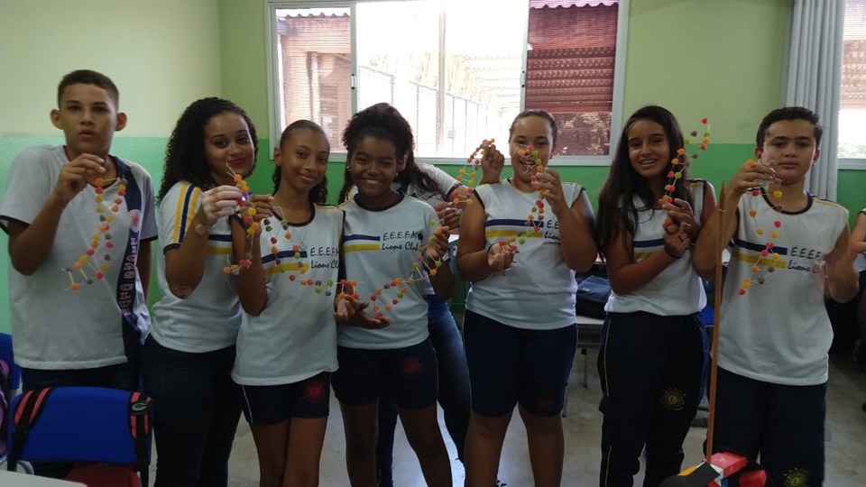 Associando a teoria com a prática, os alunos da Escola Estadual Lions Club de Colatina, desenvolveram um modelo didático utilizando jujubas para ilustrar a estrutura do ácido desoxirribonucleico (DNA), modelo pedagógico incentivado pela diretora Klécia Rizzoli.