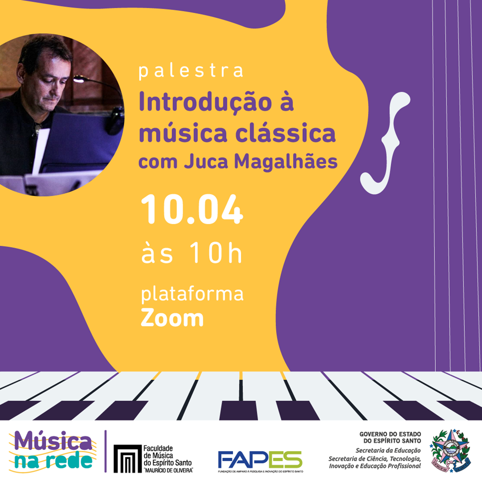 O Instituto Todos os Cantos, em parceria com Secretaria da Educação (Sedu), a Faculdade de Música do Espírito Santo (Fames) e a Fundação de Amparo à Pesquisa e Inovação do Espírito Santo (Fapes), leva aos alunos e professores da ação Música na Rede uma palestra de introdução à música clássica com o pianista do Algazarra Coral e escritor Juca Magalhães. Estão previstas duas palestras, sendo a primeira no dia 10 de abril, a partir de 10 horas. Dentro dos atuais protocolos de segurança sanitária, as palestras acontecerão no formato não-presencial, por meio da plataforma Zoom, beneficiando também, os estudantes do interior do Estado.