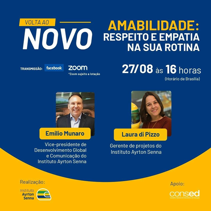 A Gerência de Estudos, Pesquisa, Qualificação e Desenvolvimento dos Profissionais do Magistério (Geped) da Secretaria da Educação (Sedu), por meio do Instituto Ayrton Senna em parceria com o Conselho Nacional de Secretários de Educação (Consed), convidam para a quarta e penúltima live da série “Volta ao Novo”, que busca apoiar o desenvolvimento das competências socioemocionais de educadores e estudantes. O tema da live é “Amabilidade: respeito e empatia na sua rotina”.