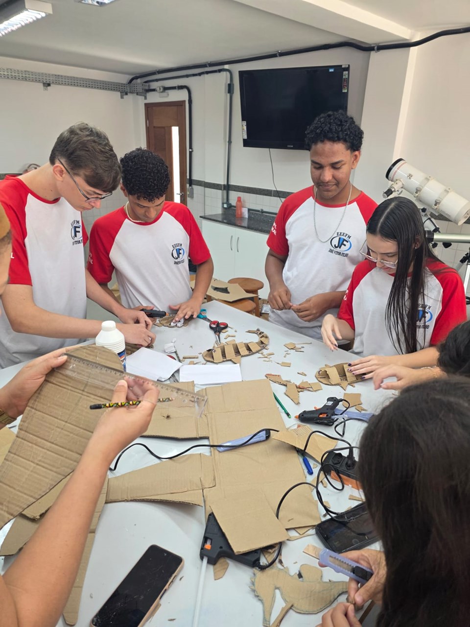 A Escola Estadual de Ensino Fundamental e Médio (EEEFM) José Vitor Filho, localizada em Cariacica, promoveu, na última terça-feira (07), uma oficina de cardboard (escultura em papelão) no laboratório de Ciências, ministrada pelos artistas plásticos Ariel Moura e Marcos Graminha, integrantes do programa de extensão universitária Laboratório de Popularização da Ciência (LabPOP), da Universidade Federal do Espírito Santo (Ufes).