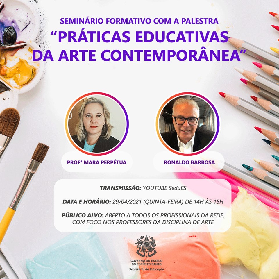 A Secretaria da Educação (Sedu), por meio da Assessoria de Educação em Tempo Integral, realizará um seminário formativo com o tema "Práticas Educativas da Arte Contemporânea". A ação faz parte do Projeto Práticas Educativas da Arte Contemporânea. O público-alvo é formado por profissionais da Rede Estadual, com foco nos professores da disciplina de Arte.  O seminário será transmitido nesta quinta-feira (29), das 14h às 15 horas, no canal da Sedu no YouTube.