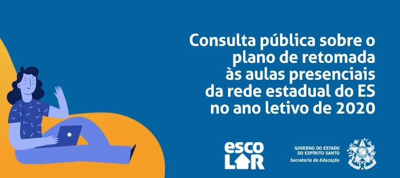 A Consulta Pública do Plano de Retomada das Aulas Presenciais para a Educação Básica nas escolas da Rede Estadual segue disponível até a próxima segunda-feira (14), no banner principal do site da Secretaria da Educação (Sedu): www.sedu.es.gov.br. As atividades estão suspensas até o próximo dia 30 de setembro e sem data definida para o retorno do funcionamento presencial das escolas, por conta da pandemia do novo Coronavírus (Covid-19).