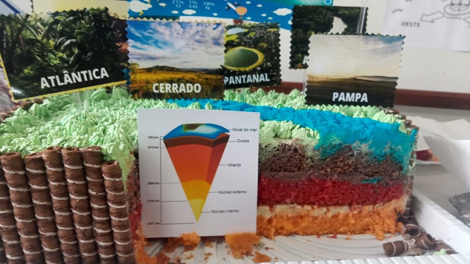 O professor Marcos Spinola utilizou um bolo confeitado, para ensinar os conteúdos aos alunos. “As camadas da terra foram exemplificadas por meio das cinco camadas do bolo, cada uma de cor diferente, que representavam: o núcleo interno, núcleo externo, manto, crosta e o nível do mar”, explicou o professor.