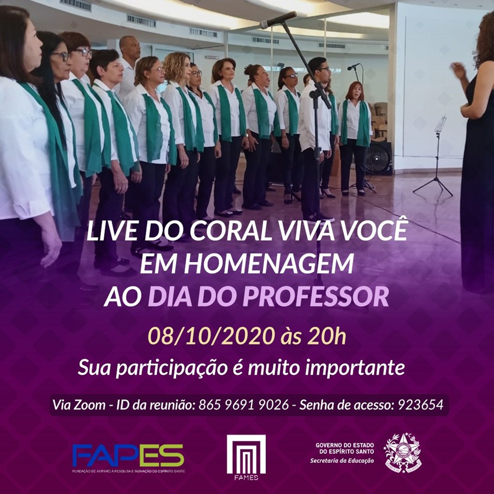 O Coral “Viva Você”, da Secretaria da Educação (Sedu), realizará uma live em homenagem ao Dia do Professor, celebrado no próximo dia 15 de outubro. A apresentação será transmitida nesta quinta-feira (08), às 20 horas, via plataforma Zoom. O momento contará com a participação do secretário de Estado da Educação, Vitor de Angelo.