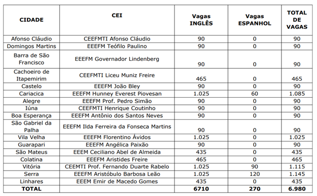 O período de inscrições para os cursos de idiomas foi prorrogado para até a próxima quarta-feira (23). Ao todo são 6.980 vagas para os cursos de Inglês e Espanhol, que serão oferecidos pelos Centros Estaduais de Idiomas (CEIs). Podem se candidatar os alunos matriculados na 1ª ou na 2ª série do Ensino Médio da Rede Estadual. As inscrições devem ser feitas exclusivamente pela Internet, no endereço eletrônico https://selecaoaluno.es.gov.br/Idiomas/.