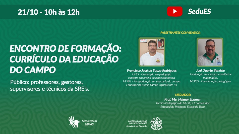 A Secretaria da Educação (Sedu) realizará o encontro de formação “Currículo da Educação no Campo”, nesta quarta-feira (21), de 10 às 12 horas, no canal da Sedu no YouTube. O público-alvo é formado por professores, gestores, supervisores e técnicos das Superintendências Regionais de Educação (SRE).