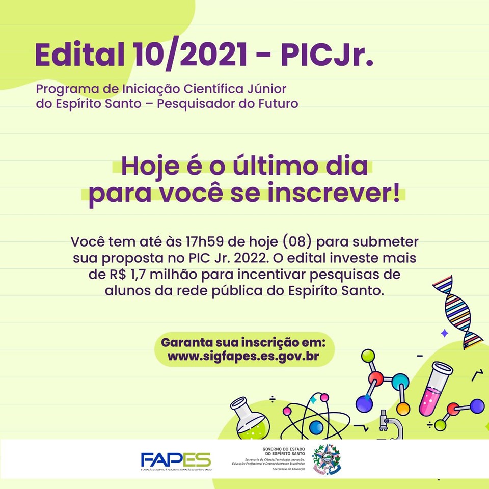 Termina, nesta segunda-feira (08), o período de inscrições para a chamada pública do Programa de Iniciação Científica Júnior – Pesquisador do Futuro (PIC Jr. 2021). A ação é da Fundação de Amparo à Pesquisa e Inovação do Espírito Santo (Fapes), em parceria com a Secretaria da Educação (Sedu).