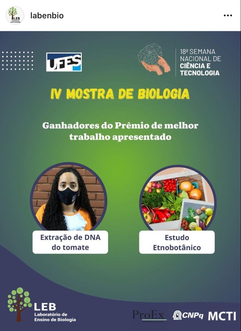 A Escola Estadual de Ensino Fundamental e Médio (EEEFM) Professor Domingos Ubaldo, de Cachoeiro de Itapemirim, participou da IV Mostra de Biologia, da Universidade Federal do Espírito Santo (Ufes). A unidade apresentou um vídeo, demonstrando a experiência de extração de DNA do tomate. E na categoria Ensino Básico, ganhou o prêmio de melhor trabalho apresentado.