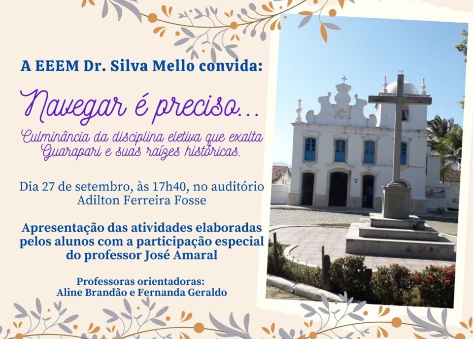 A Escola Estadual de Ensino Médio (EEEM) Doutor Silva Mello, localizada em Guarapari, vai realizar, na próxima segunda-feira (27), às 17h40, a culminância do projeto “Navegar é preciso”, desenvolvido na disciplina Eletiva, que teve como principal objetivo navegar pelas raízes históricas do município de Guarapari.