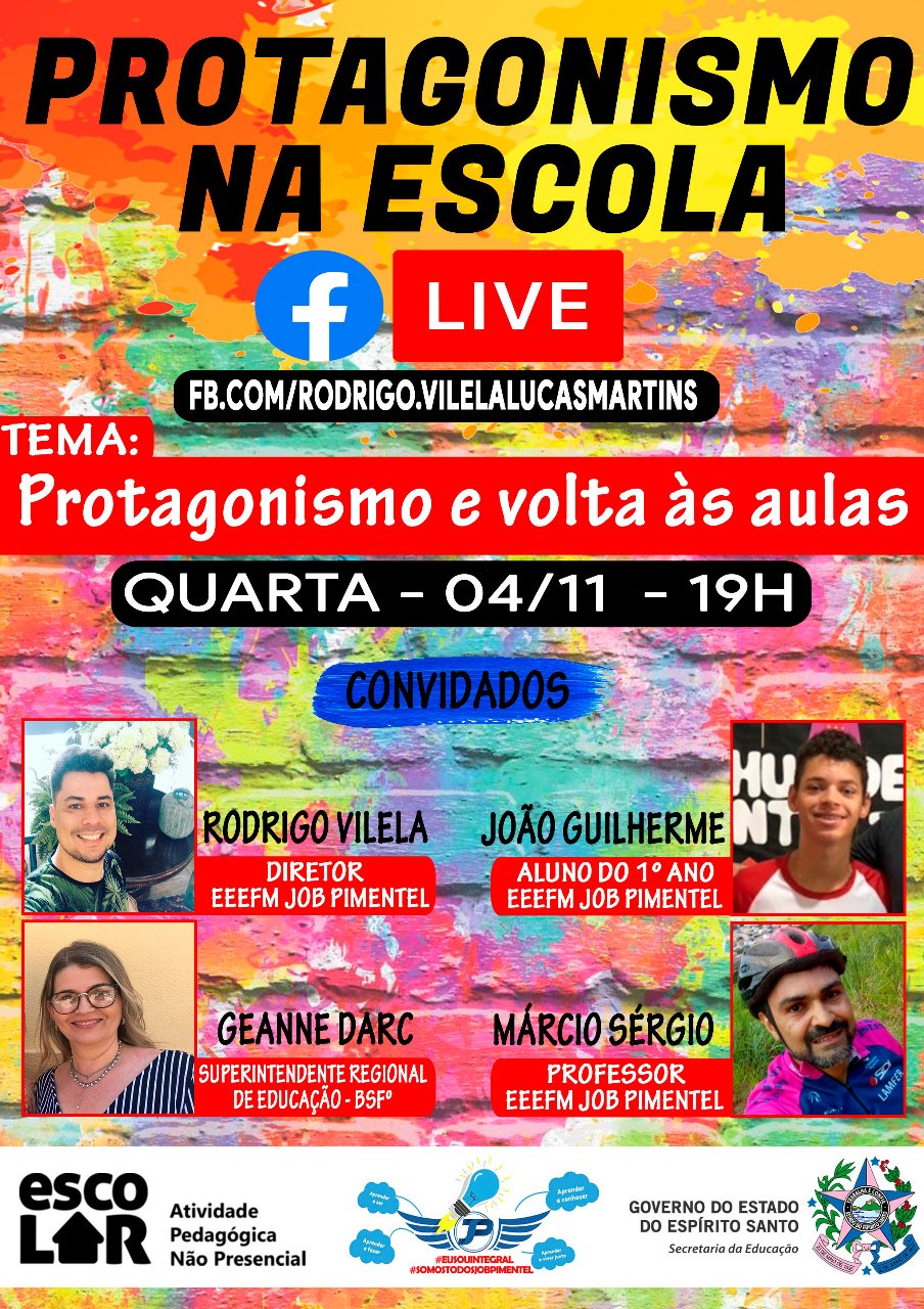 A Escola Estadual de Ensino Fundamental e Médio (EEEFM) Job Pimentel, localizada em Mantenópolis, realizará, nesta quarta-feira (04), uma live com os temas “Protagonismo” e “Volta às Aulas”. Participarão do debate o diretor da EEEFM Job Pimentel, Rodrigo Vilela; a superintendente de Barra de São Francisco, Geanne Darc; o professor Márcio Sérgio Gonçalves, e o estudante João Guilherme Prata Hueto.