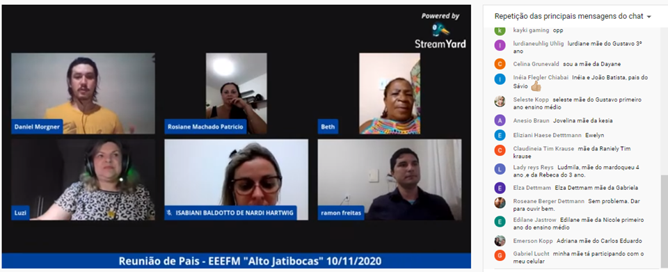 A Escola Estadual de Ensino Fundamental e Médio (EEEFM) Alto Jatibocas, localizada em Itarana, realizou pela primeira vez uma reunião de pais totalmente on-line. A equipe gestora usou o site streamyard, que é de acesso gratuito, e transmitiu a reunião ao vivo pelo YouTube.