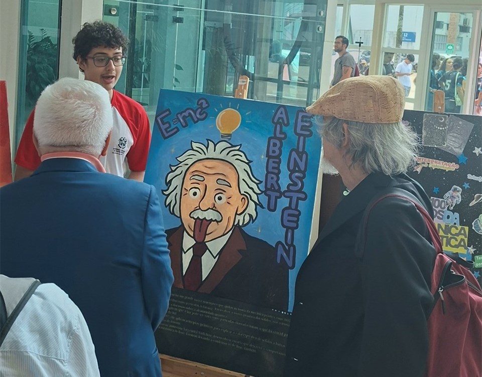 Durante o encontro, os alunos apresentaram uma exposição artística e científica com retratos estilizados e representações visuais de físicos como Schrödinger, Heisenberg, Einstein e Bohr, traduzindo conceitos complexos, como dualidade onda-partícula e o experimento do Gato de Schrödinger, em produções criativas e acessíveis. Já na mostra realizada na escola, os estudantes elaboraram banners explicativos, vídeos educativos e atividades de divulgação científica voltadas à comunidade escolar.