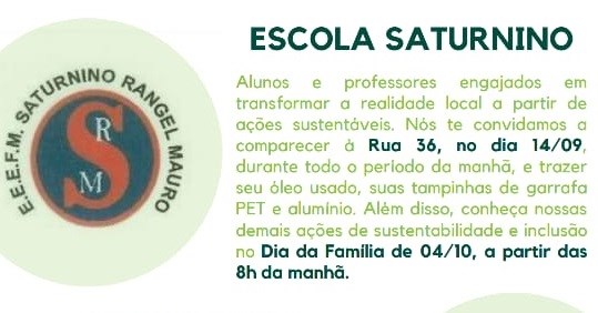 Alunos e professores da Escola Estadual de Ensino Fundamental e Médio (EEEFM) Saturnino Rangel Mauro, localizada no bairro Nova Rosa da Penha, em Cariacica, estão engajados na transformação da realidade local a partir de ações sustentáveis. Na manhã deste sábado (14), a unidade de ensino irá coletar de óleo usado, tampinhas de garrafa pet e alumínio na comunidade. O objetivo da ação é conscientizar a população sobre a importância da preservação do meio ambiente. A atividade terá início às 8 horas.