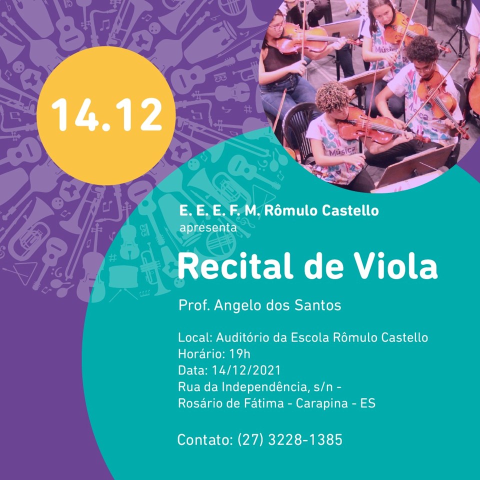 A Escola Estadual de Ensino Fundamental e Médio (EEEFM) Rômulo Castello, localizada na Serra, promove, no próximo dia 14 de dezembro, o Recital de Viola, coordenado pelo professor Angelo dos Santos. Os alunos da unidade escolar fazem parte do projeto Orquestra Sinfônica Jovem, da ação Música na Rede.