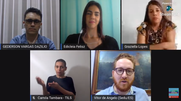 Participaram da web o secretário de Estado da Educação, Vitor de Angelo, e três profissionais da Rede Estadual: o diretor Gederson Vargas Dazilio, da Escola Estadual de Ensino Fundamental e Médio (EEEFM) José Giestas, de Afonso Cláudio; a pedagoga Graziella Gonçalves, da Escola Estadual de Ensino Fundamental (EEEF) Córrego do Cedro, em área de assentamento do município de Conceição da Barra; a professora Edicleia Feliz Ferreira, da (EEEF) Córrego Patioba, de Sooretama.