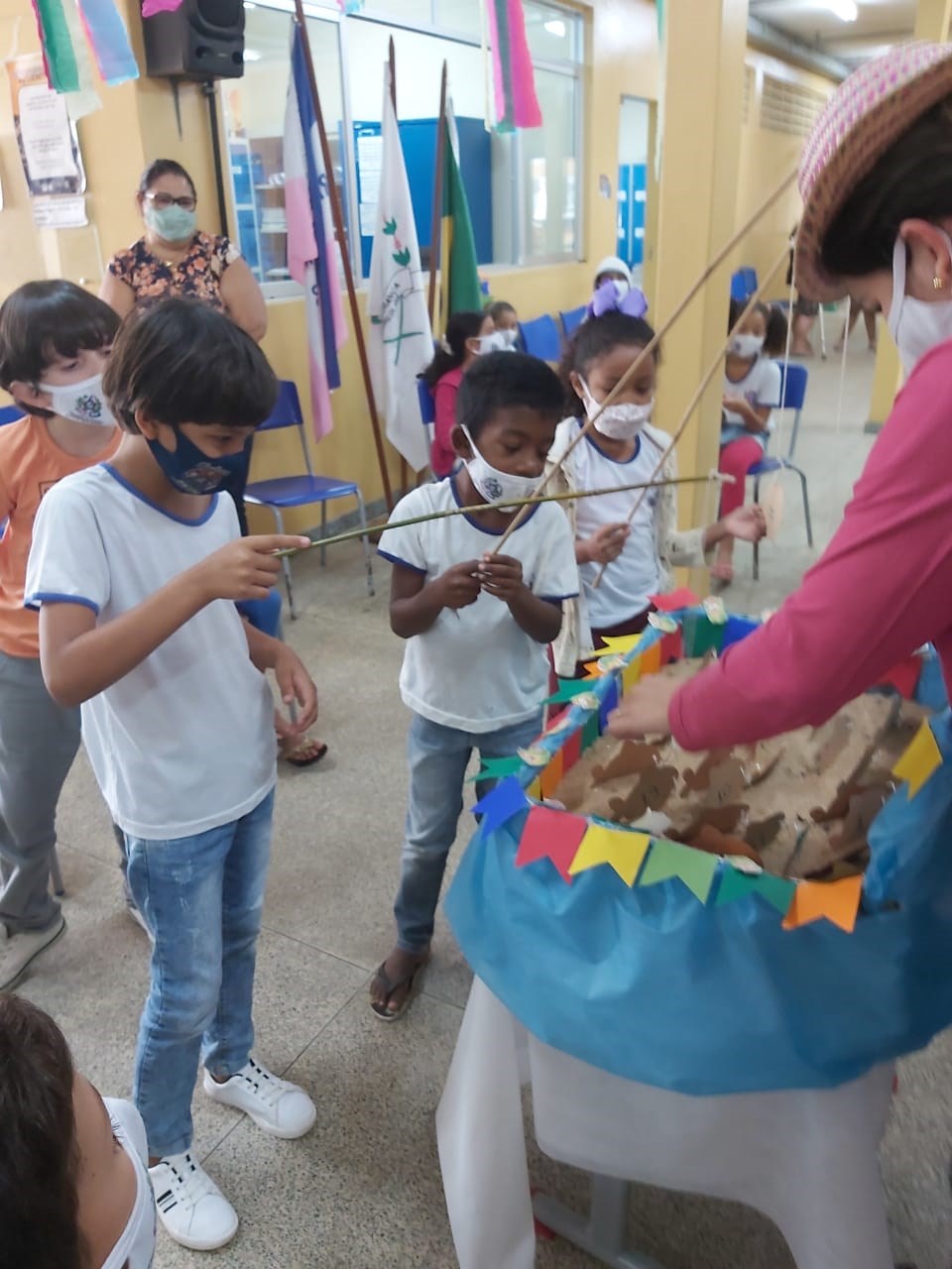 O momento contou com as tradicionais brincadeiras e comidas juninas, com foco pedagógico, como pescaria das sílabas, pipoca dos números e letras, lata das adivinhações, tomba números, entre outras.