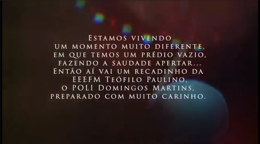 Diante da necessidade de ampliar o vínculo com a comunidade escolar durante esse momento de distanciamento social, as equipes escolares estão realizando um série de ações de incentivo às Atividades Pedagógicas Não Presenciais (APNPs). É o caso da Escola Estadual de Ensino Fundamental e Médio (EEEFM) Teófilo Paulino, em Domingos Martins, que produziu um vídeo institucional para divulgação nas redes sociais e grupos de WhatsApp, destinado a alunos e familiares.