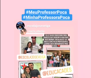 A ação lançou a hastag #MeuProfessorPoca #MinhaProfessoraPoca e contou com a participação de alunos de escolas de todo o Estado. Ainda dá tempo de ver alguns recadinhos, veja no perfil da Sedu no Instagram @educacaoes.