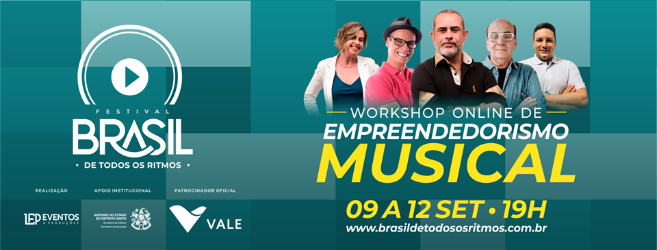 Acontece entre 9 e 12 de setembro, das 19 às 22 horas, o Festival Brasil de Todos os Ritmos, com o workshop on-line sobre empreendedorismo musical, apresentando conteúdos para aspirantes, artistas, profissionais do meio da música e empresários artísticos. O curso será ministrado por meio da plataforma Zoom, com transmissão simultânea pelo canal do festival no Youtube (youtube.com/brasildetodososritmos).