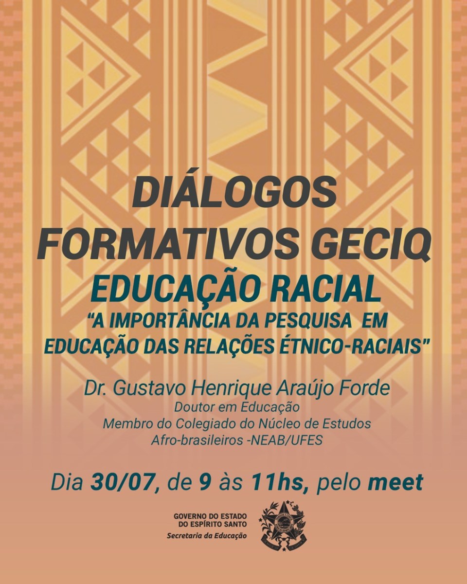 O convidado para debater sobre “A importância da Pesquisa em Educação das Relações Étnico-Raciais” é Gustavo Henrique Araújo Forde, doutor em Educação e membro do Colegiado do Núcleo de Estudos Afro-brasileiros, da Universidade Federal do Espírito Santo (Ufes). A mediação ficará com Valquiria Santos, gerente da Gerência de Educação do Campo, Indígena e Quilombola.