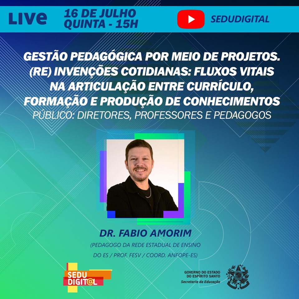 A Secretaria da Educação (Sedu), por meio da Gerência de Educação Infantil e Ensino Fundamental (GEIEF) e a Gerência de Ensino Médio (GEM), convidam diretores, pedagogos e professores para a live “Gestão Pedagógica: articulação entre currículo, formação e produção de conhecimentos”. A web será realizada nesta quinta-feira (16), às 15 horas, no canal do YouTube da Sedu Digital. O profissional convidado para o debate é o pedagogo da Rede Estadual Fabio Amorim.