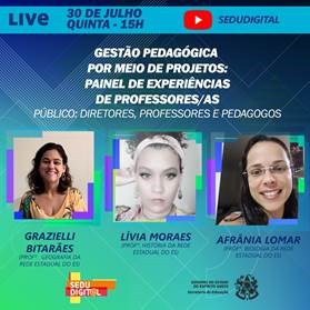 A Secretaria da Educação (Sedu), por meio da Gerência de Educação Infantil e Ensino Fundamental (GEIEF) e a Gerência de Ensino Médio (Gem) convida diretores, pedagogos e professores para a live “Gestão pedagógica por meio de projetos: painel de experiências de professores”, que será transmitida nesta quinta-feira (30), às 15 horas, no canal da Sedu Digital no YouTube.