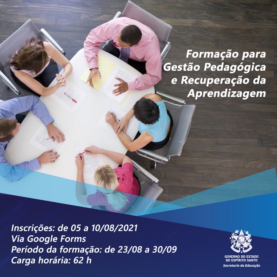A Secretaria da Educação (Sedu) promoverá a “Formação para Gestão Pedagógica e Recuperação da Aprendizagem”, ação que faz parte do Programa de Fortalecimento da Aprendizagem. A ação formativa é destinada aos pedagogos das Escolas Estaduais que ofertam Ensino Médio. As inscrições têm início nesta quinta-feira (05) e terminam na próxima terça-feira (10), pelo link do Google Forms: https://forms.gle/5tdnwPhMhRCshUi99.