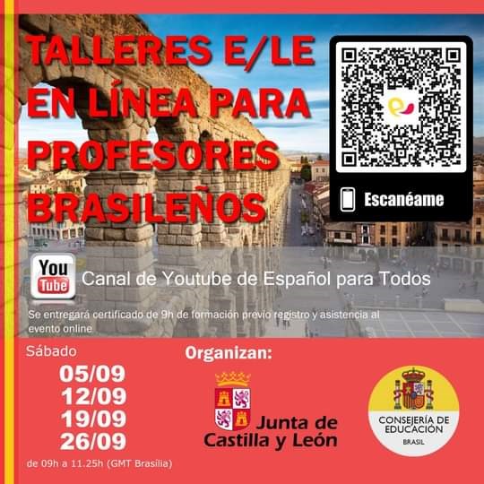 Estão abertas as inscrições para o ciclo de oficinas on-line para professores brasileiros, organizado pela Consejería de Educación da Embajada de España en Brasil e da Junta de Castilla y León. Serão quatro jornadas transmitidas nos dias 05,12,19 e 26 de setembro de 2020, a partir das 9 horas (horário de Brasília), no Youtube. Para mais informações e fazer a sua inscrição acesse o link: https://bit.ly/3fMv1Ct.
