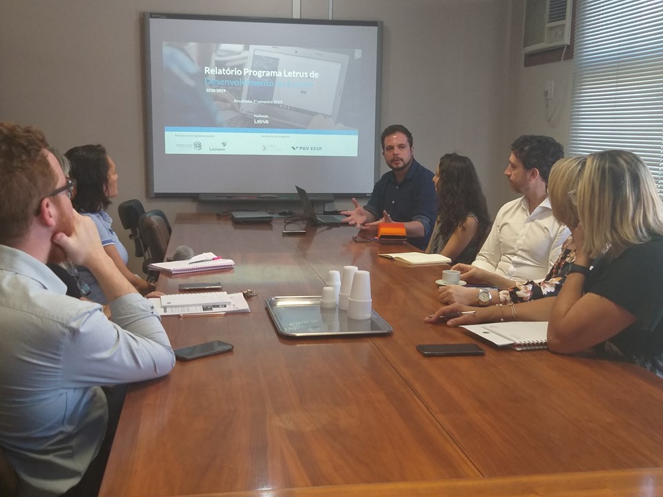 O relatório parcial do trabalho realizado nas escolas foi apresentado nesta quarta-feira (11) pela equipe da Letrus para o secretário de Estado da Educação, Vitor de Angelo. Também participaram a subsecretária de Educação Básica e Profissional, Andrea Guzzo, e a subsecretária de Planejamento e Avaliação, Isaura Nobre, além da gerente de Tecnologia da Educação, Carmem Prata, gerente de Informação e Avaliação, Denise Pereira da Silva, e subgerente Renata Marinho.