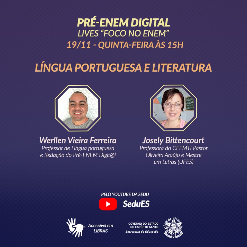 Os convidados para a live são o professor de Língua Portuguesa e Redação do Pre-Enem Digit@l, Werllen Vieira Ferreira, e a professora Josely Bittencourt, do Centro Estadual de Ensino Fundamental e Médio em Tempo Integral (CEEFMTI) Pastor Oliveira Araújo, localizada em Vila Velha.