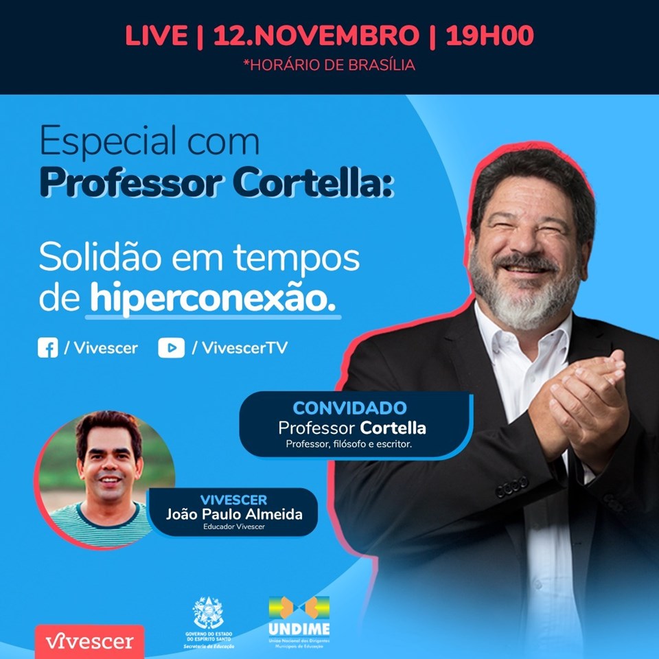 A Vivescer, plataforma gratuita de apoio pedagógico e desenvolvimento da dimensão socioemocional dos docentes do Espírito Santo, realizará uma live especial com o professor Mário Sergio Cortella, com o tema “Solidão em tempos de hiperconexão”. A transmissão será realizada nesta quinta-feira (12), às 19 horas, nas redes sociais da Vivescer.