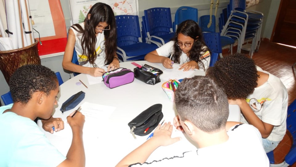 Após uma aula expositiva e dialogada, foi proposto aos estudantes que expressassem, através de desenhos, poemas e opiniões, como eles enxergam as ações negativas executadas pelo homem.
