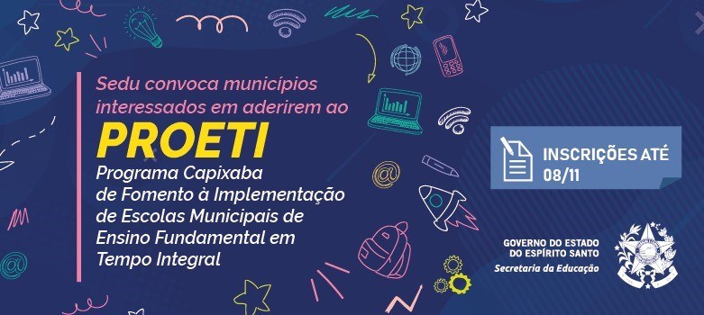Os municípios interessados em aderirem ao Programa Capixaba de Fomento à Implementação das Escolas Municipais de Ensino Fundamental em Tempo Integral (PROETI), têm até a próxima segunda-feira (08) para solicitar. Clique AQUI e leia atentamente o documento.