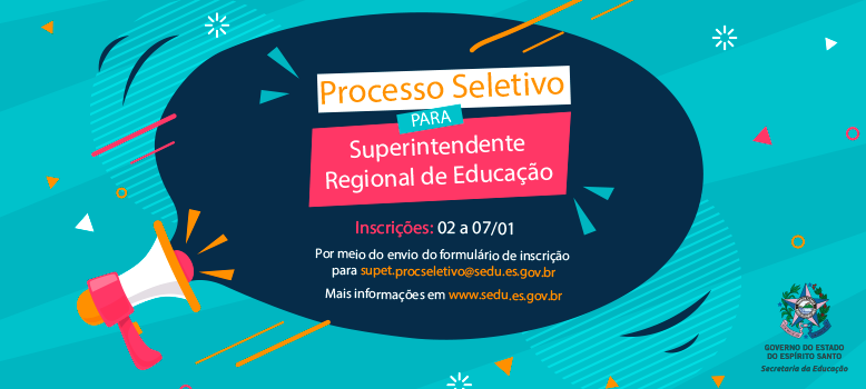 Termina nesta terça-feira (07) o período de inscrição do processo seletivo para escolha de superintendentes Regionais de Educação. Podem se inscrever os profissionais efetivos do magistério estadual, enviando formulário preenchido e assinado para supet.procseletivo@sedu.es.gov.br