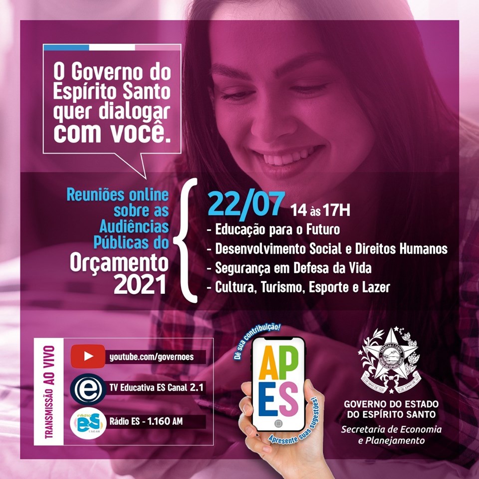 A população capixaba vai dialogar com secretários e dirigentes de órgãos do Governo do Estado, nesta quarta-feira (22) e na quinta-feira (23), em encontros virtuais das Audiências Públicas para a elaboração do Projeto de Lei do Orçamento 2021. Esses encontros serão transmitidos, ao vivo, pelo canal do Governo no YouTube, pela TVE e pela Rádio Espírito Santo.