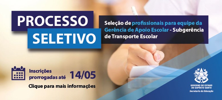 A Secretaria da Educação (Sedu) prorrogou o período de inscrição do Edital de Processo Seletivo Simplificado n° 07/2021, que estabelece normas para seleção de profissionais do magistério, efetivos e estáveis da Rede Estadual, para atuação na equipe da Gerência de Apoio Escolar - Subgerência de Transporte Escolar. As inscrições podem ser feitas até esta sexta-feira (14).