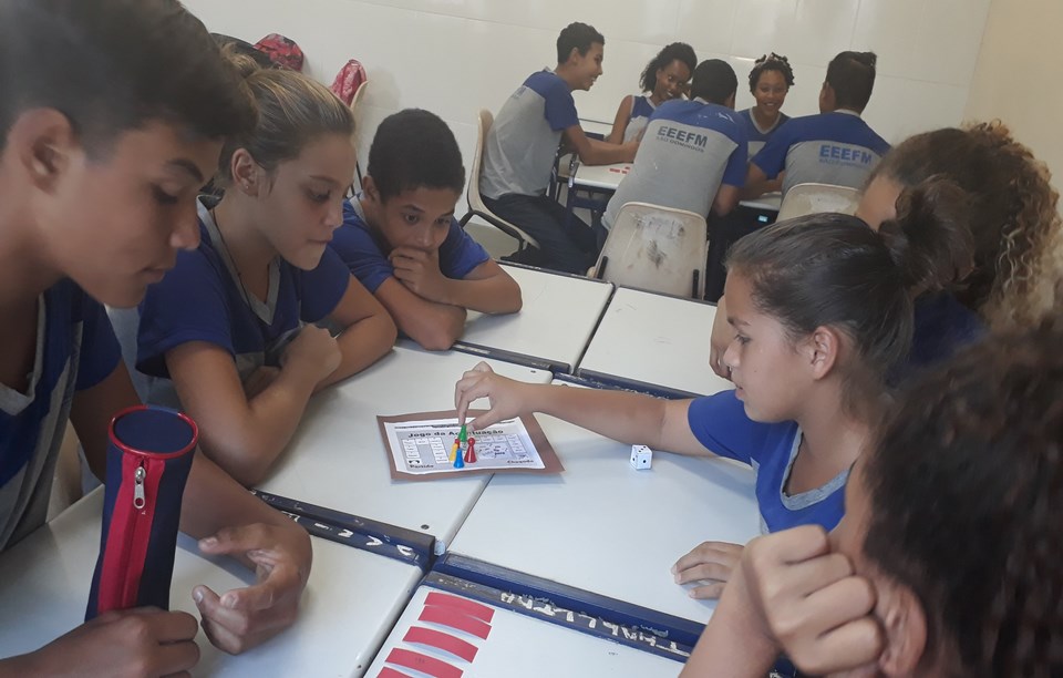 A turma do 7ª ano do Ensino Fundamental foi dividida em grupos de até quatro participantes. Cada grupo recebeu um tabuleiro com palavras que recebem acentos, um dado e peões de identificação do jogador.