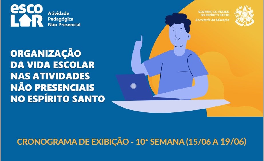 A Secretaria da Educação (Sedu) divulgou, nesta segunda-feira (15), a programação da 10ª semana do EscoLAR, que está disponível no site do programa: www.sedu.es.gov.br/escolar (no menu “Grade de Programação da TV”). A exibição das videoaulas é realizada pelos canais 8.2, 8.3 e 8.4 da TV aberta. O cronograma das atividades entre os dias 15 e 19 de junho, bem como das demais semanas, pode também ser acessado pelo site www.simnoticias.com.br.